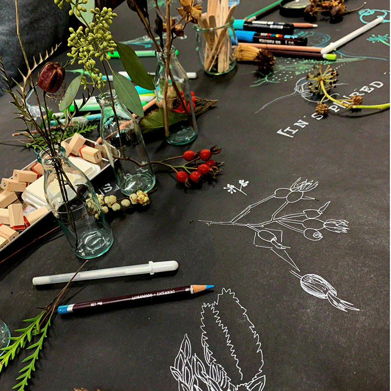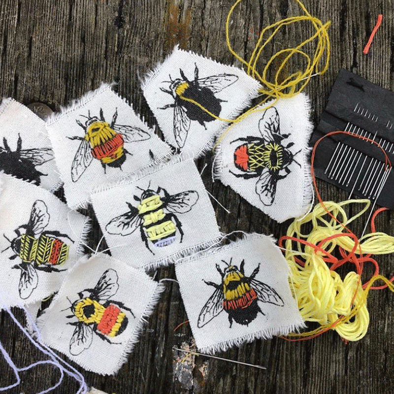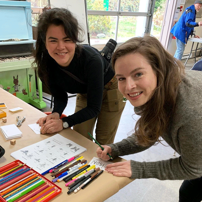 From left to right, 1) Tyler Kelly demonstrates B.C. bee diversity to enthusiastic new members. 2) Marika van Reeuwyk and Allison Dennert create name tags at Lori Weidenhammer’s art activity table. 3) A display of Thanushi Eagalle’s bumble bee embroidery activity. 4) Jasna Guy’s “Inspired by Nature” drawing table. Photos by S. MacTavish (1) and J. Guy (2, 3, 4).