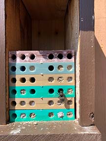 April 14, 2021: The first hole in the corn plastic bee housing is filled. By April 17, three holes are filled. By April 22, eleven are filled.