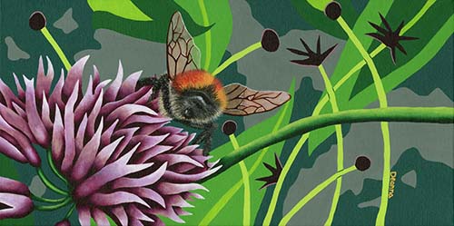 Image 1 (top left): "Stella" by Deanna Flig, 10"x20" acrylic on canvas. "[Stella] is a bumble bee (no idea on identification) having a great time on a chive. All of my artwork is inspired from my own photographs."