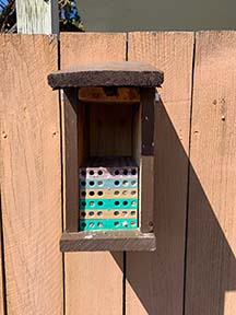Bees are seen mostly in the middle of the day – flying in and out, peeking from their cavity to see if it's safe, coming out to do a quick 180 then reenter backwards, slipping and sometimes falling in completing that last wall of the tube, resourcefully scooping up mud dropped on the ledge of their home. One day a few small red eyed insects were spotted hovering near the entrance holes and were soon identified as Houdini flies, a species related to fruit flies. They are trying to lay their own eggs in the mason bees’ pollen caches. Fortunately they are slow moving and it was possible to remove some.